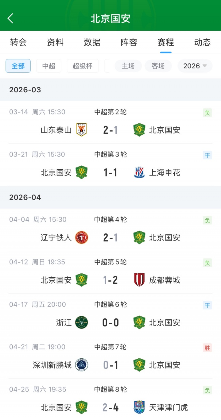 04月25日讯 中超第8轮,北京国安主场2-4不敌天津津门虎。近7轮仅1胜。